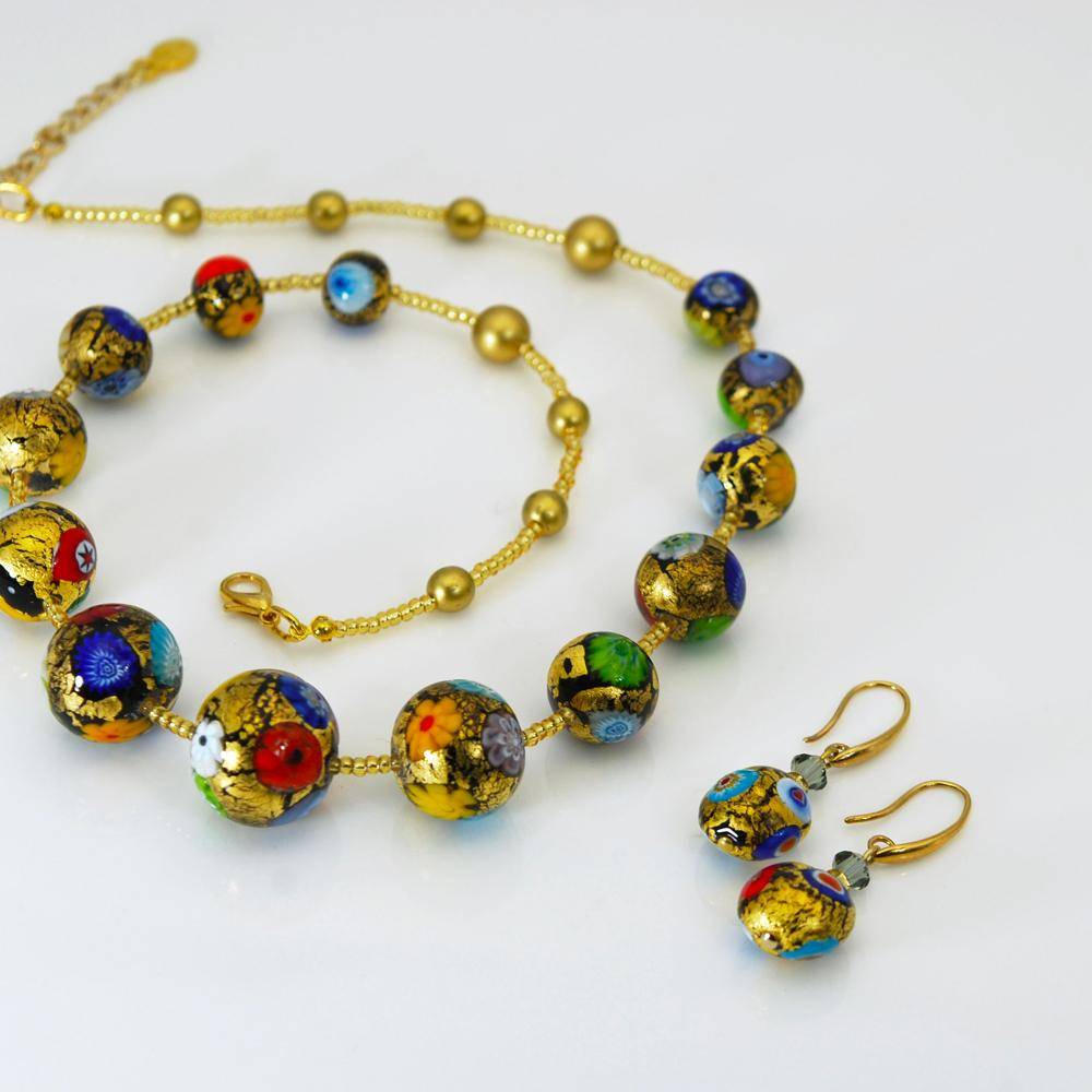 Kette und Ohrringe mit Perlen aus Murano Glas mit „Millefiori Murrine“, 24-karätiger Goldfolie und „Conteria“. Länge 45 cm mit Ausdehnung 5 cm. Nickelfrei vergoldet galvanisierter Verschluss. 1 Vorschläge A