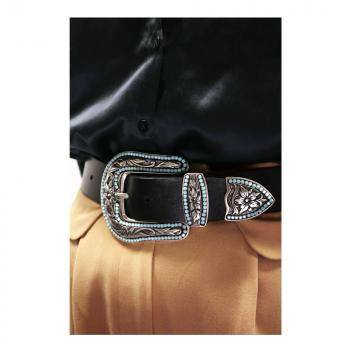 Cintura basica alta 4 cm in cuoio toscano di spalla bovina dello spessore di 0.4 mm, colore nero. La fibbia gioiello in lega di zama nichel free color argento antico con passante e puntale abbinati, rivela intarsi floreali ossidati a contrasto, strass turchesi e cristalli incastonati.