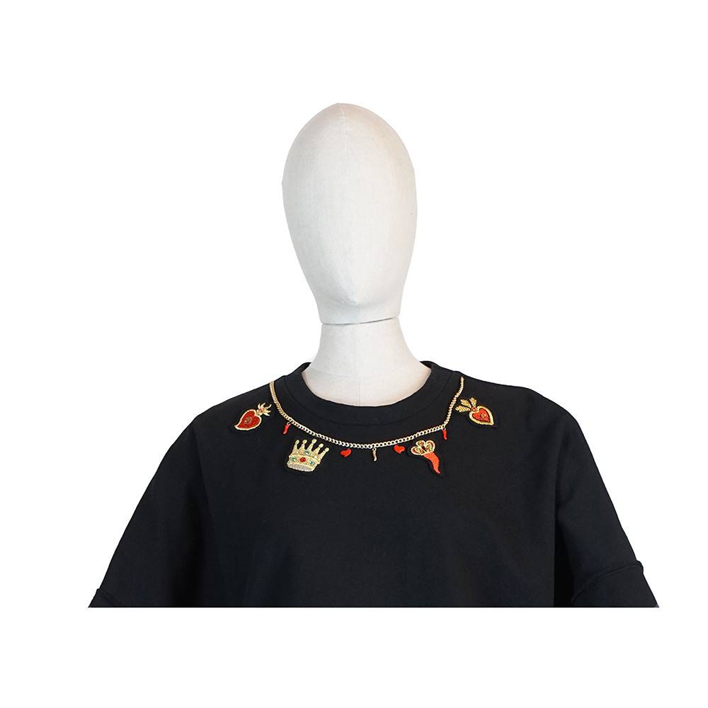 Felpa 90% cotone 10% elastan molto duttile da abbinare sia in modo casual che smart. Applicazioni a imitazione collana con charmes ricamati appositamente a macchina e rifiniti a mano