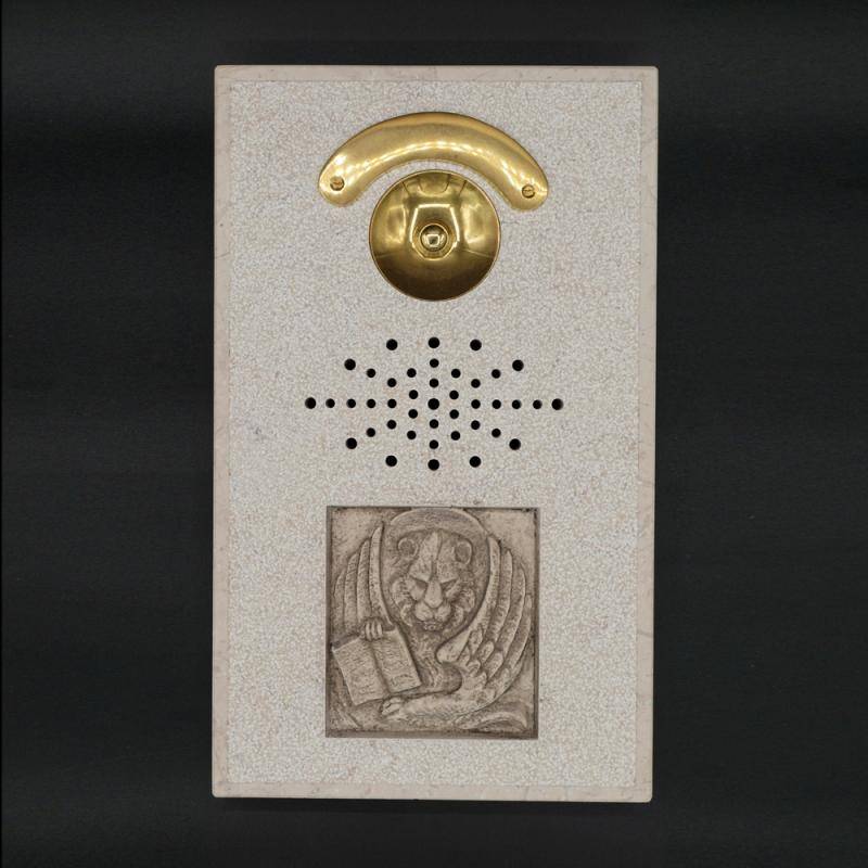 piastra in marmo con lavorazione bocciardata e cordellina levigata completa di campanello a ciotola completo di pulsante in ottone di fusione, targhetta lucida semicerchio in ottone di fusione completa di fori per citofono e bassorilievo inciso nel marmo di leone di venezia
