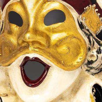 Hängende schmückende Maske, durch Goldfolie und Acrylfarben verziert.