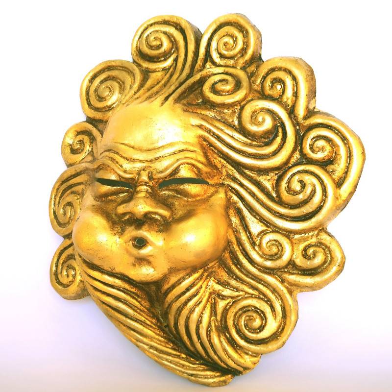 Maschera decorativa di Eolo in cartapesta fatta a mano, rifinita con foglia d'oro o argento e invecchiata a cera