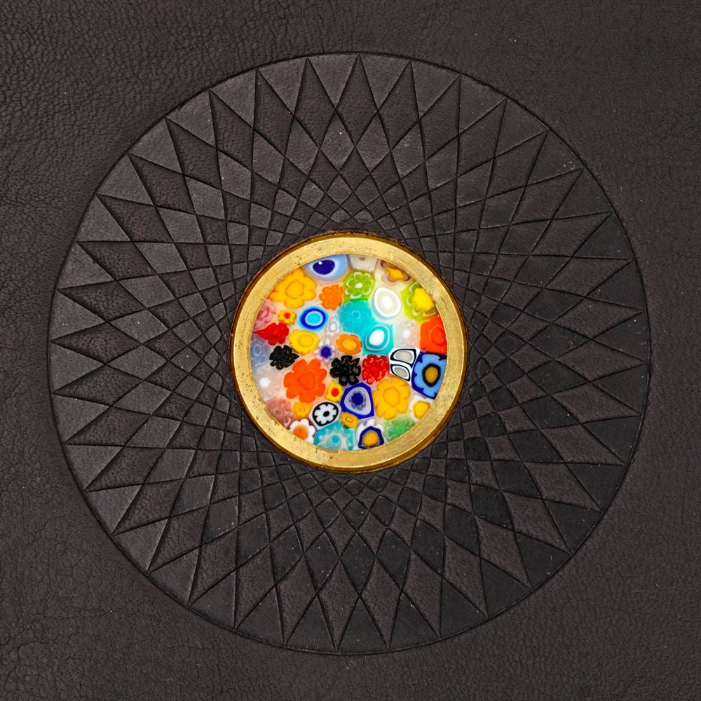Gebundenes Heft aus Leder, weiße Blätter, mit im Zentrum eingesetztem „Murrina“. Weicher Einband
