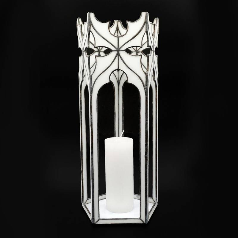 Portacandele in tiffany (vetro e stagno) a forma di prisma a base pentagonale la cui decorazione rappresenta la polifora del secondo piano nobile dell'omonimo palazzo veneziano