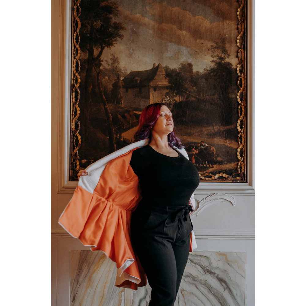 Made of shiny wool fabric and lined in a flaming orange colour with an intense red base, it cannot go unnoticed.