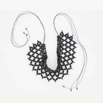 Black and midnight blue, made entirely by hand through the "quilling" technique with Japanese Shin Inbe handmade paper. It is a one-off piece.