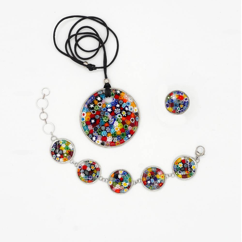 Set composed of pendant, ring and bracelet with murrine mosaics mounted in tiffany (glass and tin)