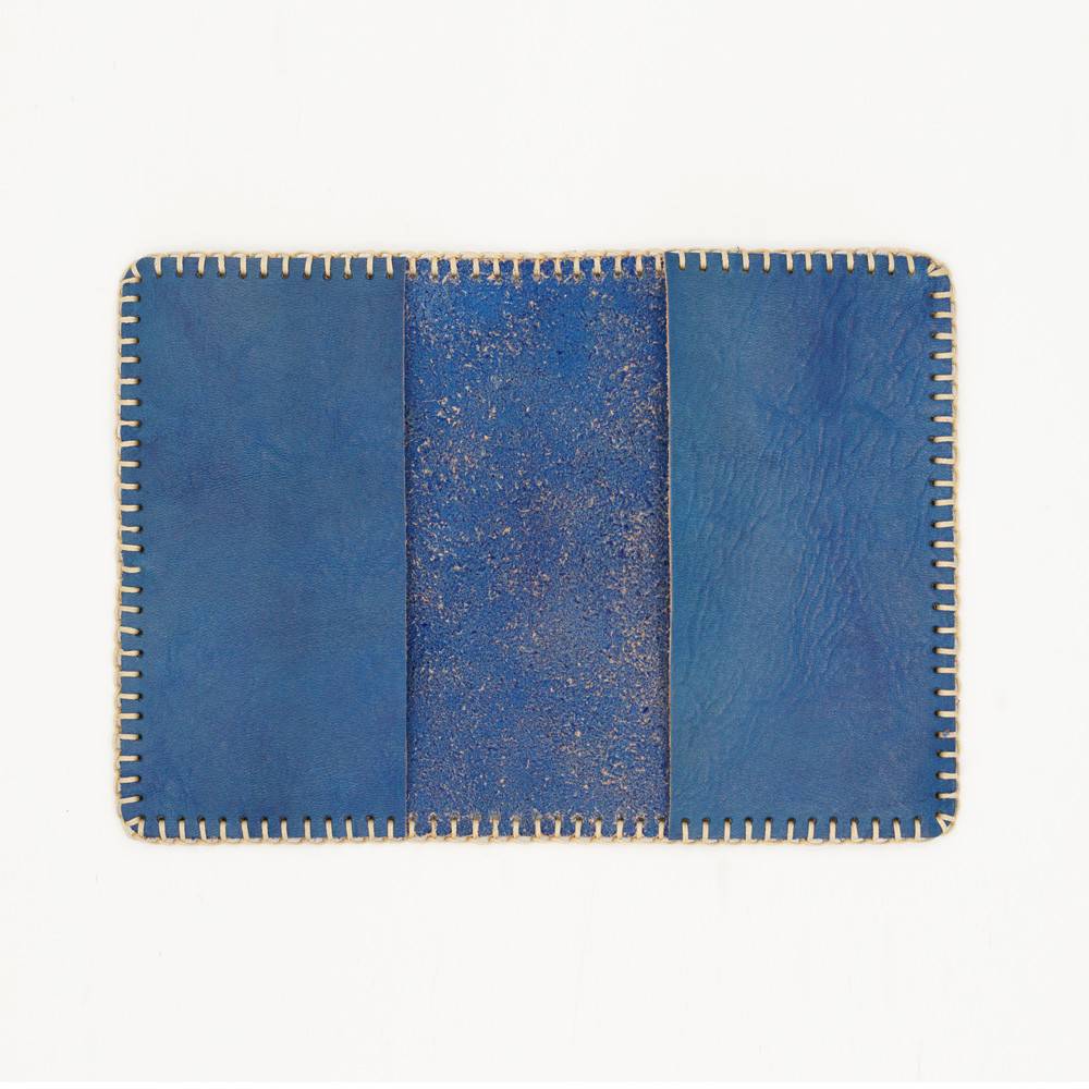 portapasaporte en cuero cosido a mano con murrina incrustada