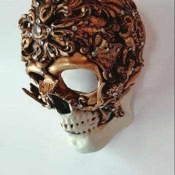 Máscara de papel maché, pieza única, decorada con aplicaciones extraídas de frisos originales, cubierta con pan de oro o plata y acabados con cristales.