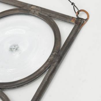 Pequeño ventanal encuadernado al plomo con el clásico motivo de la tradición veneciana llamado “a rui”. Los "rui" son discos de vidrio soplado con el "ponteo" en el centro. En esta vidriera estàn dispuestos en 3 x 3.