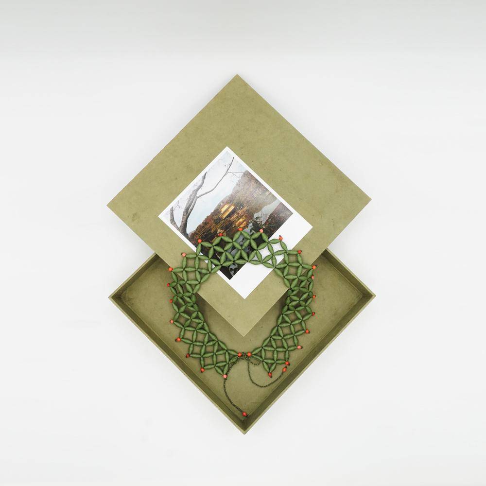 Vert sous-bois, réalisé entièrement à main à travers la technique "quilling", avec papiers artisanales japonaises Shin Inbe. Pièce unique. Personnalisation du couleur, de la forme, de la proportion et du motif sur demande du client.