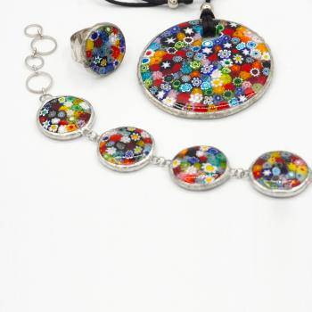 Pendentif diamètre cm 7,5, bague réglable avec mosaïque rond de diamètre de 3 cm et bracelet avec 5 mosaïques de murrine longueur réglable de cm 19 à cm 22