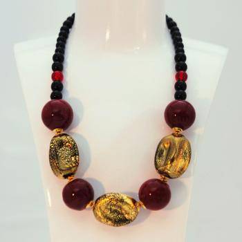 Collier perles en verre de Murano soufflées avec feuille d'or 24Kt. et perles soufflées neutres. Longueur 45 cm avec chaîne de prolongement 5cm. Mousqueton galvanisé or nickel-free. 2 Propositions: Noir, Rouge/noir