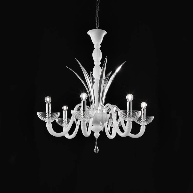 Chandelier blanc laiteux 6 lumières avec épées en cristal, fait entièrement à main avec les techniques du verre de Murano par les maîtres Gianni & Loris Signoretto. (VO 130/L/6)