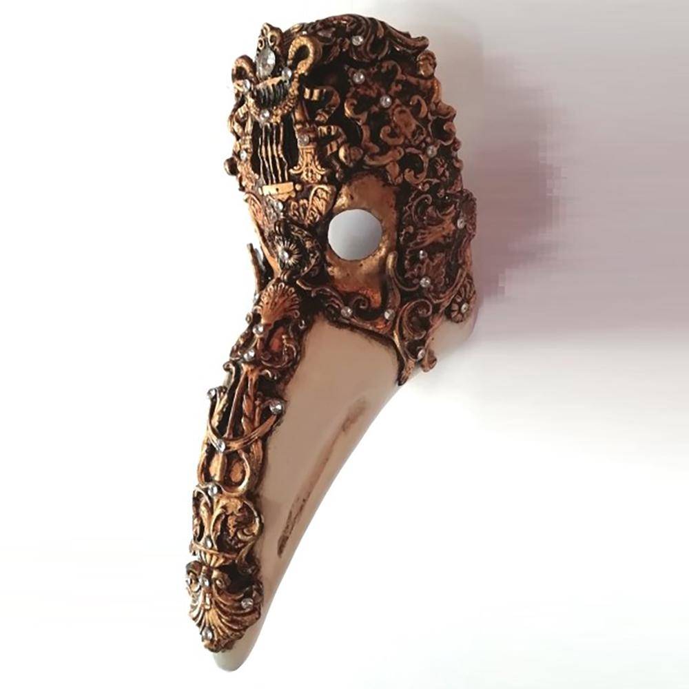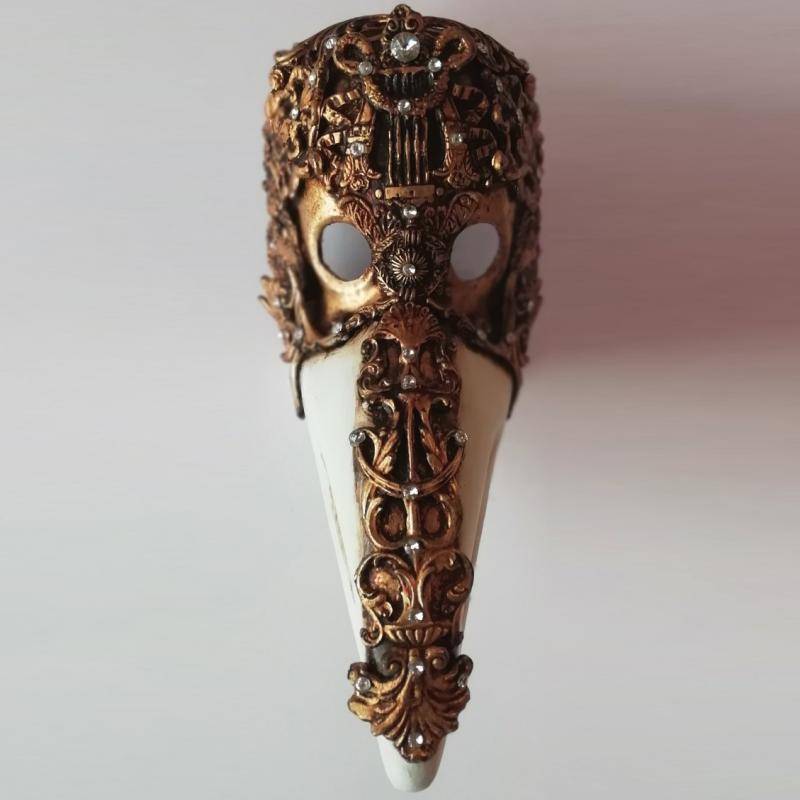 Masque en papier mâché, pièce unique, décorée avec applications tirées de frises originales, recouverte avec feuille d'or, d'argent ou effet ivoire et finitures avec cristals.