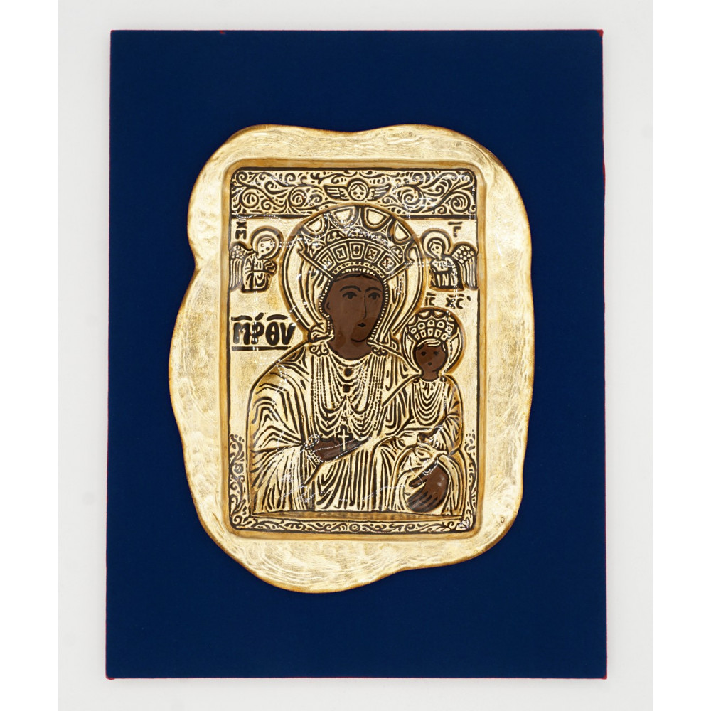 Bas-relief en verre de Murano inspiré à la Madone de la Santé, gardée dans la Basilique de Santa Maria della Salute à Venise. Icône byzantine du XIII siècle originaire de la Candia (aujourd'hui Crète); elle a été amenée à Venise dans le 1670, an de la libération de la peste. Le bas-relief est appliqué sur un panneau recouvert de velours couleur bleu ou rouge, au choix du client. Le produit est, en outre, fourni d'un étui spécifique. Les couleurs du panneau et l'étui sont associés.
