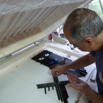 Sculpture représentante une masque africaine réalisée avec la technique de la fusion du verre avec verre noir et cannes de murrine. L'oeuvre a été mise au four en fusion pour deux fois. La première fusion a été faite à 800° pour bien faire adhérer les cannes de verre, ensuite l'objet a été entièrement gravé à main avec des meules diamantées et seulement à la fin à été faite la deuxième fusion à 650° pour donner une forme plus rond à l'objet. Pièce unique et inimitable.