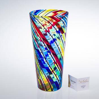 Vase conique en verre soufflé réalisé à Murano par Angelo Ballarin à travers le rapprochement de pièces de verres de diffèrents couleurs. Après la création de la composition, les cannes de verres sont fondues ensemble et travaillées pour créer la forme souhaitée. Les couleurs sont: bleu, aigue-marine, rouge, jaune et filigrane noire. Le résultat final est une oeuvre de design élégante, originale et moderne. Le produit est signé à la base par Angelo Ballarin. Les petites imperfections détectables sont la preuve de l'exécution manuelle du produit.