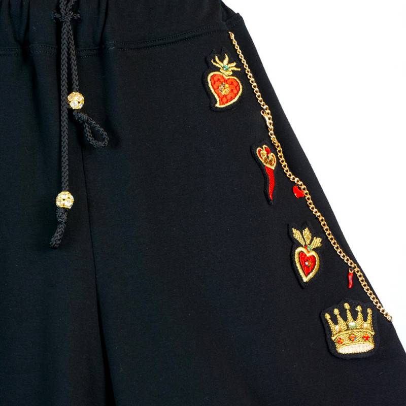 Pantalons en molleton 90% coton 10% elastan. Applications sur le bord, poche à l'imitation d'un collier avec charmes brodés à machine et finis à main. Coulisse avec boule en strass