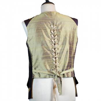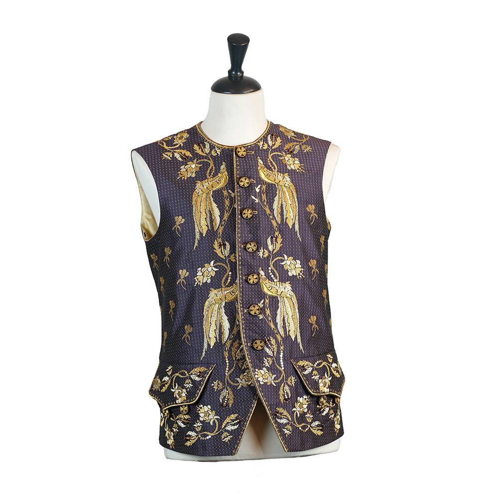 Gilet élégant pour costume 1760. Taille d'époque et travail très précis. Brodure exclusive à machine et fini à main. 60% viscose, 40% a.f. Dos extensible 100% soie