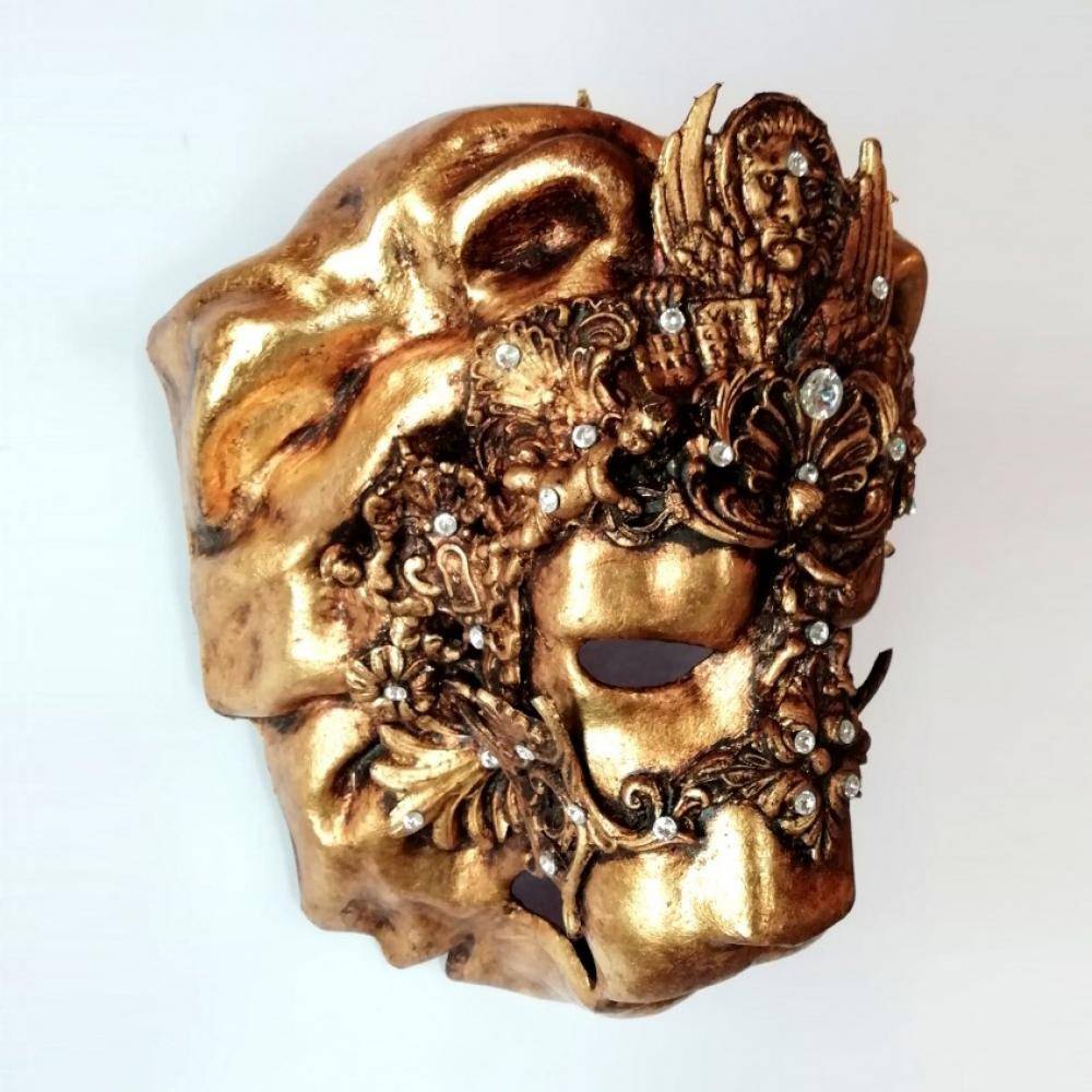Maschera in carta pesta, pezzo unico, decorata con applicazioni tratte da fregi originali, ricoperta con foglia d'oro e finiture con cristalli
