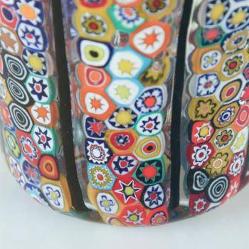 Vaso conico in vetro soffiato realizzato da Angelo Ballarin secondo la laboriosa tecnica della Murrina che consiste nell’accostamento e nella fusione di piccoli pezzi di canne di vetro caratterizzate da disegni floreali. Le Murrine sono anche conosciute come "Millefiori" poiché ricordano le meravigliose composizioni floreali della natura. La tecnica è stata rivisitata in chiave moderna grazie all'inserimento di bacchette di filigrana nera che rendono la composizione finale più moderna. Il risultato è un vaso dal design elegante e raffinato. Il prodotto è firmato alla base da Angelo Ballarin. Le piccole imperfezioni che si possono riscontrare sono la garanzia di un'esecuzione manuale del vaso.