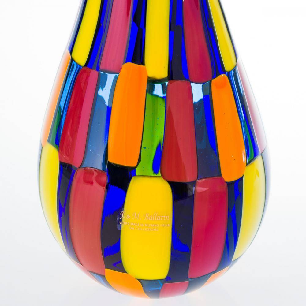 Composto da sei bicchieri e una caraffa, questo set in vetro soffiato viene realizzato a Murano da Angelo Ballarin. I colori di questo servizio vogliono rendere omaggio alla tradizionale festa del Redentore che si svolge ogni anno a Venezia e culmina in un incredibile spettacolo pirotecnico. La vivacità di questo design è data dal contrasto creato dall'accostamento di formelle in vetro colorato trasparente e pastello. I colori del vetro pastello sono: rosso, arancione e giallo. I colori del vetro trasparente sono: blu e acquamarina. Ogni prodotto è firmato alla base da Angelo Ballarin. Le piccole imperfezioni che si possono riscontrare sono il segno dell'esecuzione manuale dei prodotti.