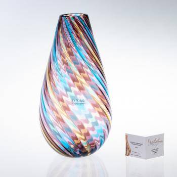 Овальная ваза из выдувного стекла, изготовленная на Мурано Анджело Балларином путем комбинирования стеклянных тростей разных цветов. После создания композиции трости сплавляются вместе и обрабатываются для придания желаемой формы. Используются следующие цвета: аквамарин, желтый, розовый и аметист. Конечный результат - это произведение элегантного и изысканного дизайна. Изделие подписано у основания Анджело Балларином. Мелкие недостатки, которые можно обнаружить, являются гарантией ручного исполнения вазы.