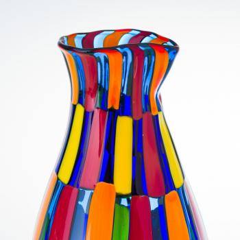 Этот набор из выдувного стекла, состоящий из шести бокалов и графина, изготовлен в Мурано Анджело Балларином. Цвета этого набора призваны отдать дань уважения традиционному празднику Искупителя, который ежегодно проходит в Венеции и завершается невероятным фейерверком. Живость этому дизайну придает контраст, созданный сочетанием прозрачных и стеклянных плиток пастельного цвета. Цвета пастельного стекла: красный, оранжевый и желтый. Цвета прозрачного стекла: синий и аквамарин. Каждое изделие подписано на основании Анджело Балларином. Небольшие дефекты, которые можно обнаружить, являются признаком ручного исполнения изделий.