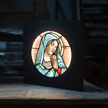Художественный витраж, свинцовый переплет и роспись гризайлью. Деревянный лайтбокс, окрашенный в черный цвет, со светодиодной панелью 60x60 см. Электрический провод из черной ткани и итальянская электрическая вилка L-типа.