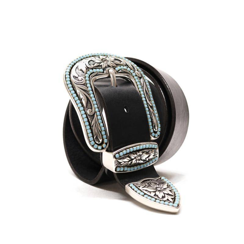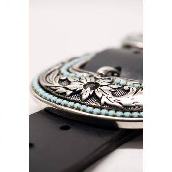 Основной ремень высотой 4 см из тосканской воловьей кожи толщиной 0,4 мм, черного цвета. Похожая на драгоценный камень застежка из безникелевого сплава zamak, цвета античного серебра, с подходящей петлей и наконечником, украшена контрастными оксидированными цветочными вставками, бирюзовыми стразами и наборными кристаллами.
