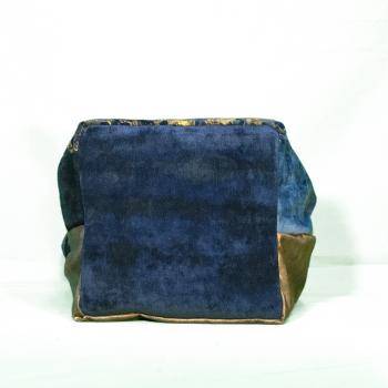 Сумка из хлопкового бархата с ручной печатью на деревянных матрицах, золотой анималистический дизайн, бархатные ручки и дно, задняя часть из золотой технической ткани, внутренняя подкладка с карманом на молнии. Застежка с 4 перекрещенными золотыми зажимами.