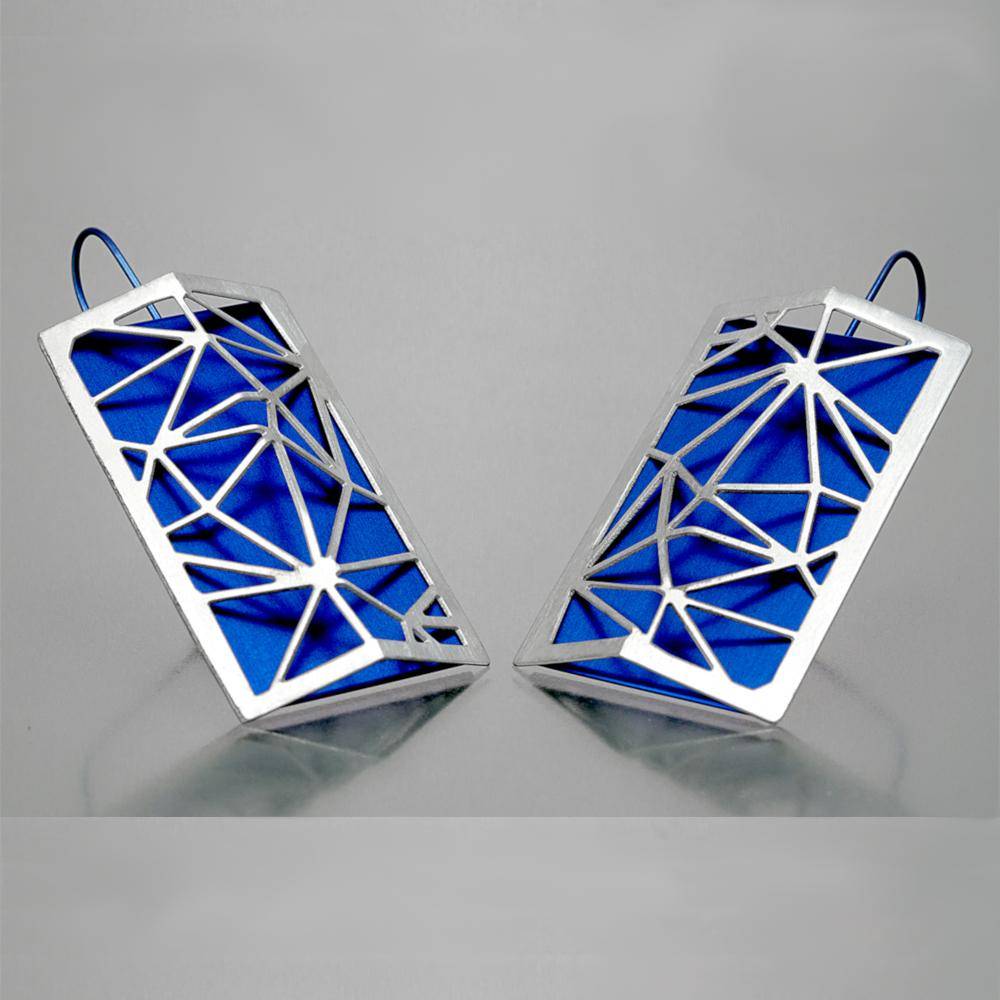 "Треугольники" из синего анодированного чистого титана и серебра 925 пробы. Ажурная техника.