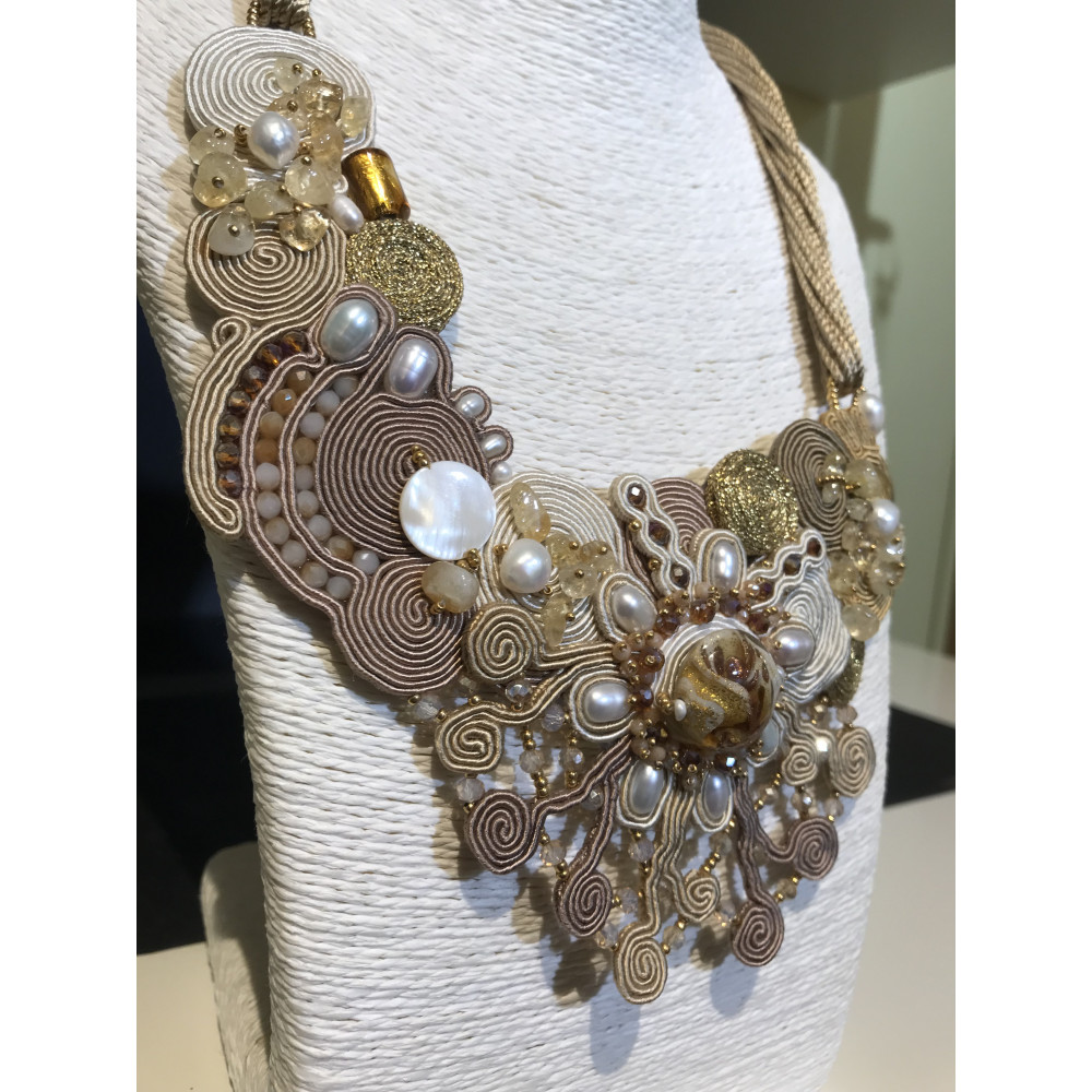Collana realizzata con piattina di seta cucita a mano con l'inserimento di perle in vetro di Murano, perle di fiume, quarzo citrino, madreperla, cristalli e perle placate oro 24 kt. Chiusura con catenella di 5 cm. in argento italiano 925 placato oro 24 Kt.