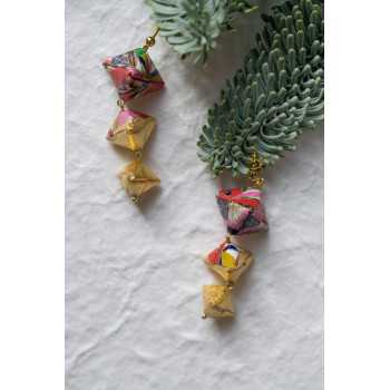 Multicoloured pattern earrings, entirely handmade using the origami technique with Japanese Chiyogami craft papers.