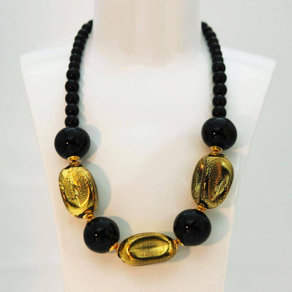 穆拉诺玻璃珠项链,用24克拉金箔和吹制的珠子吹制。长45厘米,链子延长5厘米。镀锌金无镍扣。2项提案。黑色,红色/黑色