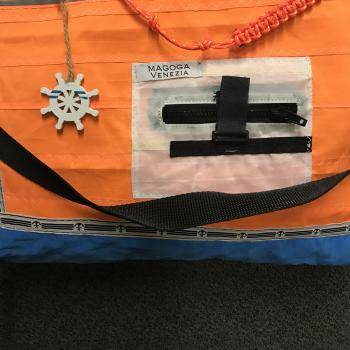 手工制作的包,我们的设计,从风筝冲浪回收中获得的Dacron材料,带拉链的外部口袋,另一个带拉链的内部口袋,两个上部的航海把手,肩带,都可以调节,可清洗和维修。