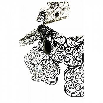 这个项圈由黄铜金属制成,用黑色油漆处理,既可以作为项链佩戴,也可以作为头冠佩戴。用cabuchon和施华洛世奇水晶(Daniel Swarovski &Co.的组件)进行修饰,它完美地适合许多不同的情况,从幻想的服装到婚礼,从晚礼服到时尚的牛仔裤。一个尺寸适合所有。材料容易成型。