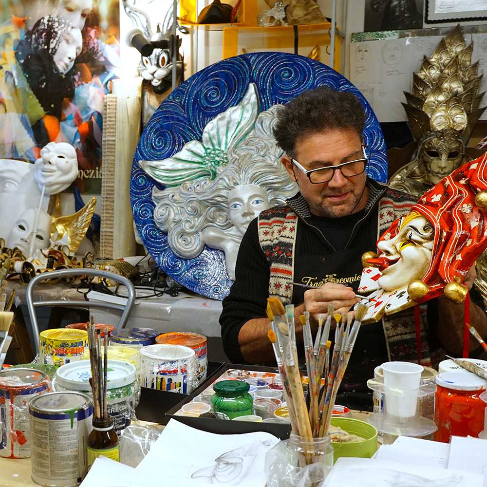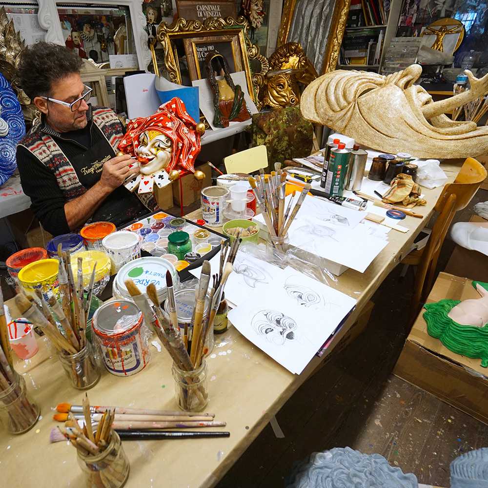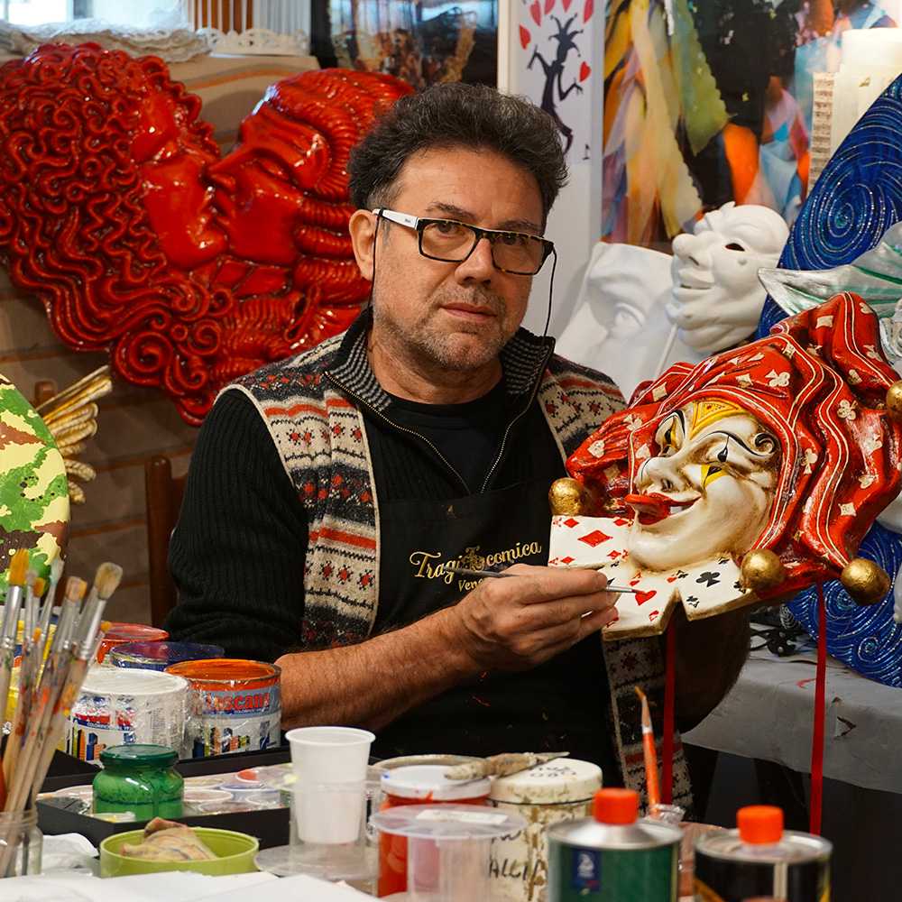 (悲喜剧). Gualtiero Dall'Osto作为Emilio Vedova的学生在威尼斯美术学院接受了艺术培训,并与国内和国际剧院和基金会以及Maurice Bejart等编舞家和布景设计师合作。二十多年来,他一直在组织 "Mascheranda",这是威尼斯狂欢节最丰盛的活动之一。 2014年,他共同创立了 "Compagnia l'Arte dei Mascareri",这是一个文化协会,汇集了威尼斯传统面具的艺术、工艺和爱好者。他与他的妻子Giuliana和他的员工一起,在威尼斯市中心的面具车间和服装工作室工作,在那里,他也在来自世界各地的学生的帮助下,用纸塑、铁、皮革和许多其他材料创作他的作品。在威尼斯的神奇魅力中,手工艺的传统继续赋予面具和服装等宝贵而独特的艺术形式以生命。Tragicomica通过制造转化来进行这些创作。