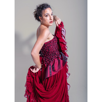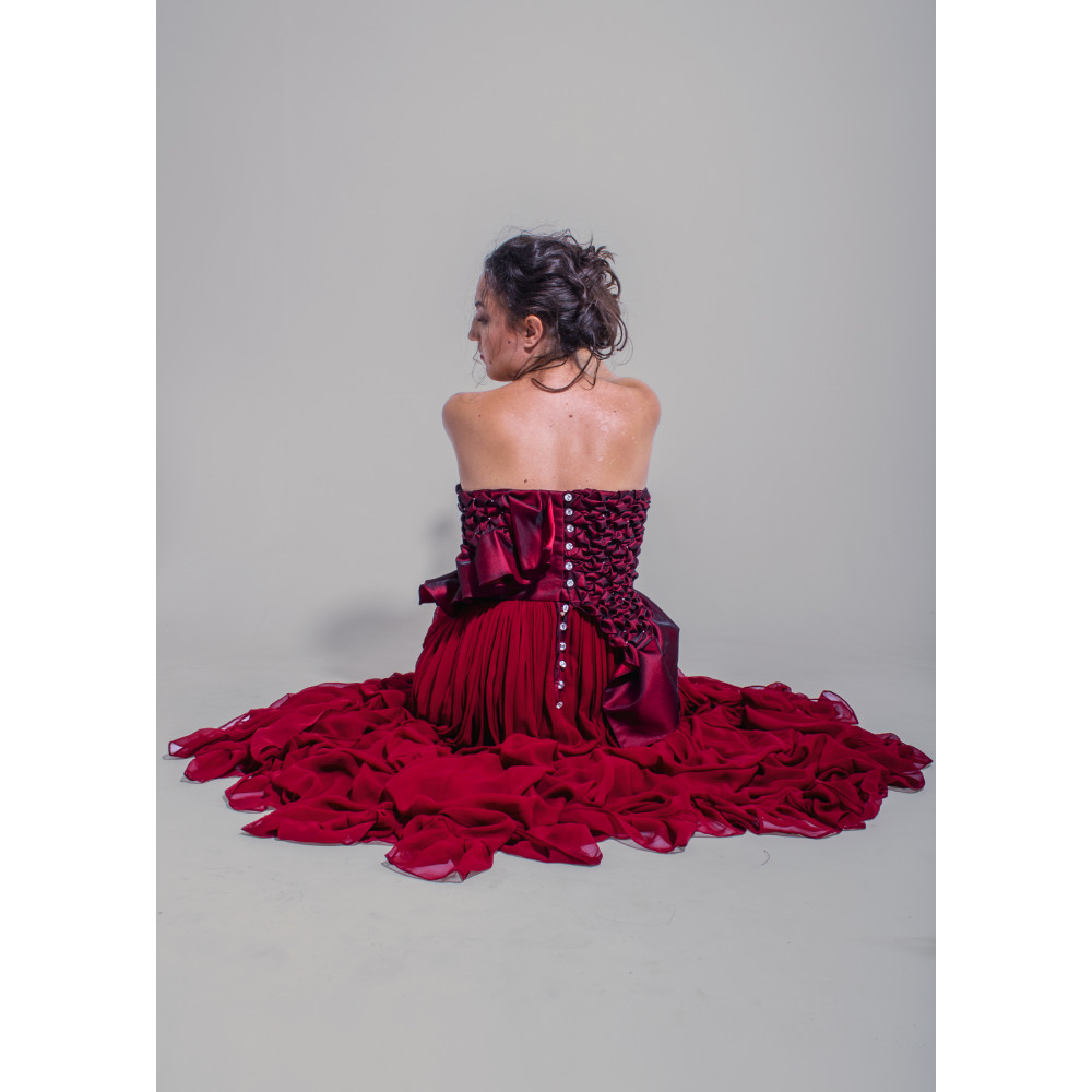 44号晚礼服,由3层红色真丝乔其纱组成的裙子,在腰部聚集,共13米,基本的上衣是 "mikado "真丝混合面料,富含Swarovsky圆点。在外裙的底部有一条"米卡多 "织物带。在内裙的底部缝有加固物,以方便行走。