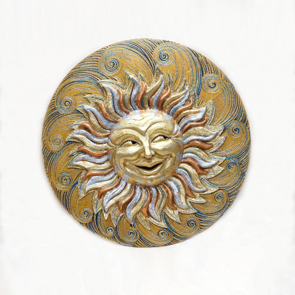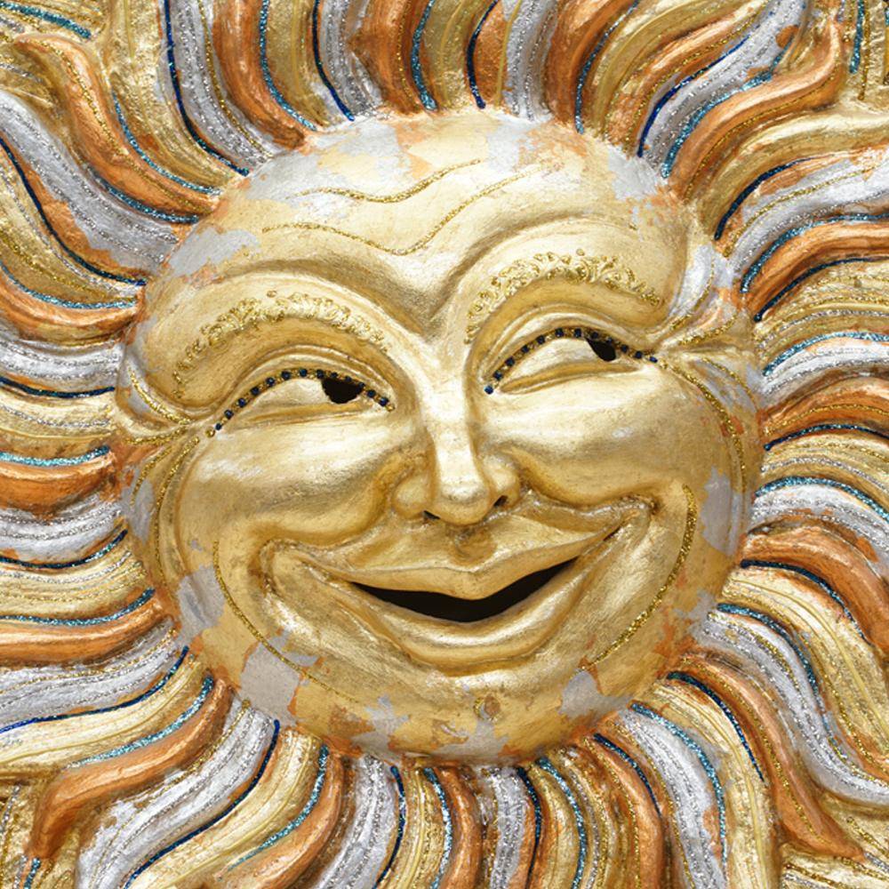 木板上的纸塑面具雕塑,金箔装饰,与亮片